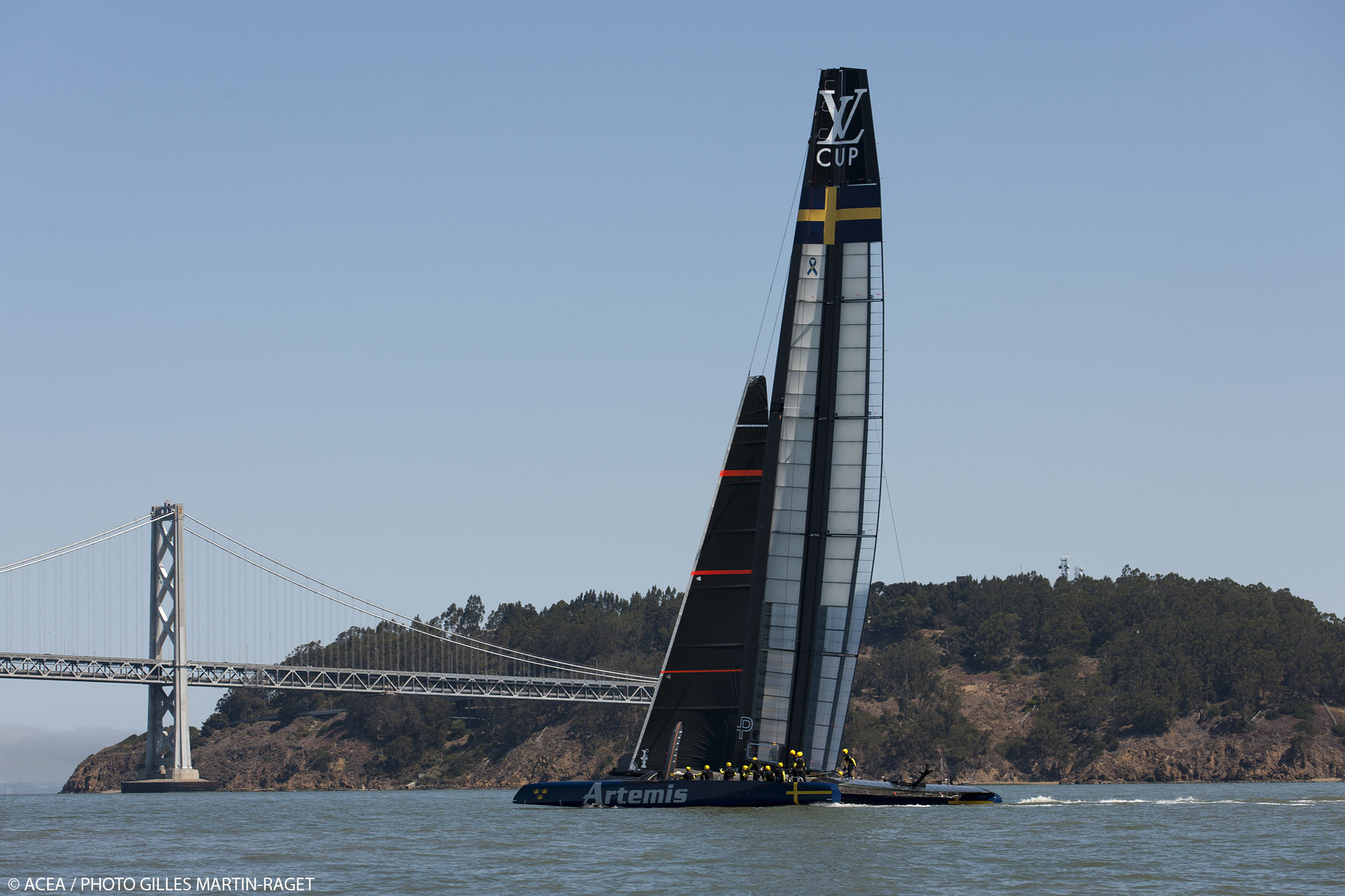 Artemis Racing hizo un espectacular debut en San Francisco con la primera navegación del “Big Blue” el catamarán gigante de color azul del equipo Sueco. El Artemis destruyó su primer bote en la tragedia que acabó con la vida de Andrew “Bart” Simpson, y no había podido competir en las regatas Round Robin de la Copa Louis Vuitton hasta ahora.