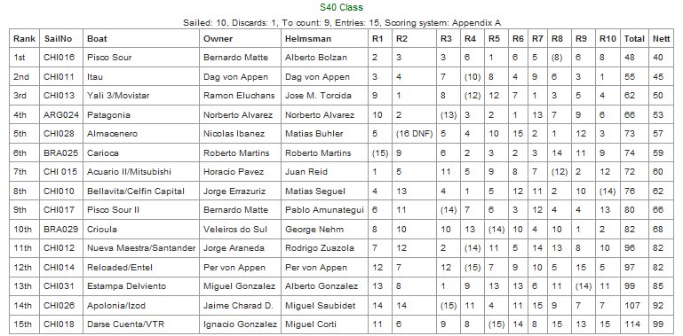 El nivel de competitividad es tan alto, que los equipos apuestan a mantenerse constantes sacando buenos lugares ojalá adentro de los primeros cinco siempre, aunque esto es más fácil decirlo que hacerlo y el que logró realizar este objetivo fue claramente el Pisco Sour, quienes terminaron con una clara ventaja sobre el resto de la flota ganando apenas una regata. Su peores regatas fueron dos 8vos, obtenidos apenas en los últimos días.