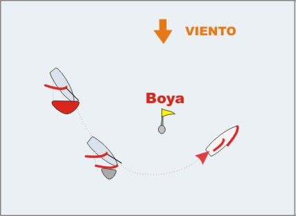 Cuando dos barcos llegan en lucha a la boya (circulo de radio dos esloras), la prioridad será la del barco que se meta por el interior. El barco del exterior debe mantenerse apartado y evitar colisionar. Por esta razón buscaremos la posición que nos permita meternos por dentro frente al contrario. Y para ello debemos mantener la máxima velocidad hasta llegar al círculo de 2 esloras.