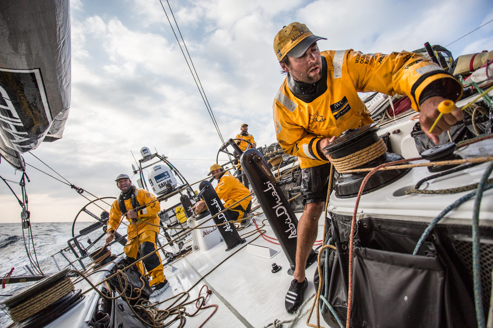 January 12, 2015. Leg 3 onboard Abu Dhabi Ocean Racing. Daryl Wislang prepares to shake a reef onboard Abu Dhabi Ocean Racing.