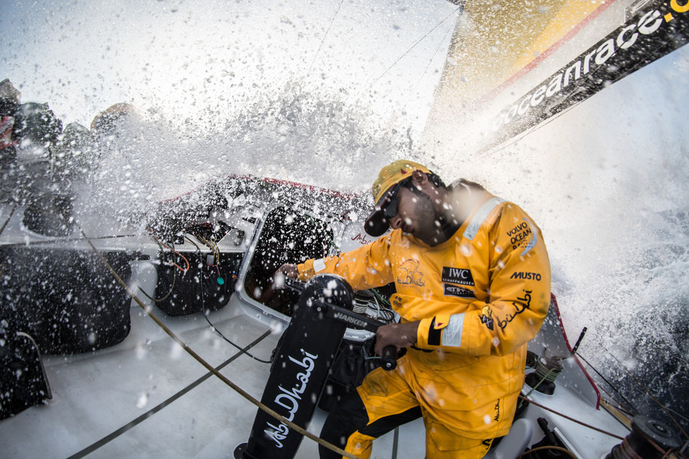 January 12, 2015. Leg 3 onboard Abu Dhabi Ocean Racing. Adil Khalid tries to duck for cover while triming the jib as a wave spashes over “Azzam” in the channel between India and Sri Lanka