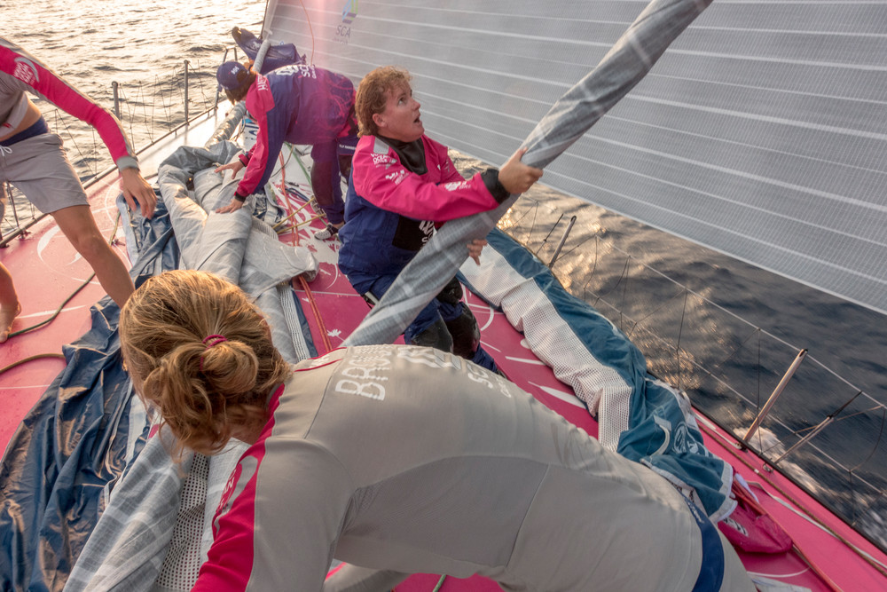January 12, 2015. Leg 3 onboard Team SCA. Sunrise peel to the FR0 from the Masthead Zero.