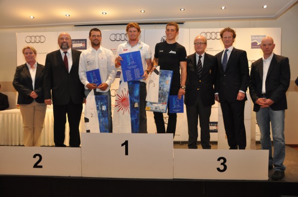 Andrew Maloney (NZL), Tonci Stipanovic (CRO) y Tom Slingsby (AUS) tercero a primer lugar, fueron premiado con pinturas de Segelbild.de’s Heinke Böhnert y se subieron al podio mientras se tocaba el himno nacional de Australia en honor al ahora pentacampeón mundial.
